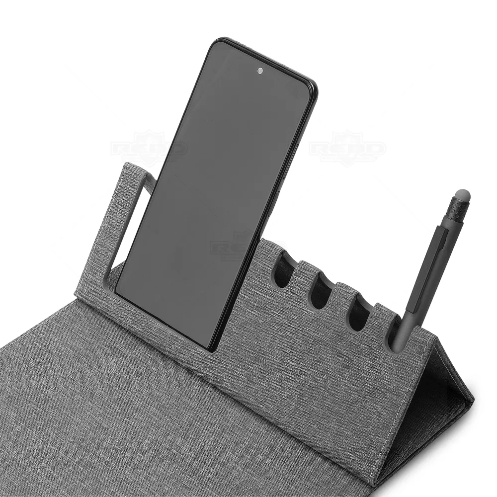 Transforme e organize seu espaço de trabalho com o Mouse Pad em material reciclável, projetado para oferecer mais do que uma simples superfície para o mouse. Este versátil acessório inclui porta-canetas integrado e um prático suporte para celular ou cartões, adicionando sofisticação e funcionalidade ao seu ambiente. Personalize-o com seu logo para destacar sua marca de forma elegante e profissional. (*Imagem Ilustrativa, itens não acompanham o produto).