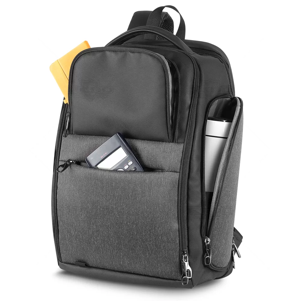 A mochila para notebook, produzida em poliéster é uma solução prática e versátil para transportar seus dispositivos e pertences com segurança e organização. O compartimento principal é espaçoso e inclui uma divisória almofadada especialmente projetada para proteger o seu notebook, garantindo que seu dispositivo esteja seguro contra choques e arranhões, a parte frontal é forrada e conta com bolsos interiores, oferecendo espaço organizado para canetas, documentos, telefones e outros itens pequenos, a parte posterior da mochila é almofadada e equipada com um sistema de apoio acolchoado para as costas As alças de ombro também são acolchoadas e ajustáveis, permitindo um ajuste personalizado para o máximo conforto, possui ainda uma alça trolley, que permite fixá-la sobre a alça de uma mala, e ainda, alça de mão reforçada oferece uma opção alternativa de transporte, ideal para quando você precisa pegar a mochila rapidamente. Uma característica moderna e prática desta mochila é a saída USB integrada, que permite conectar um power bank (não incluído) e carregar seus dispositivos móveis enquanto você está em movimento, esta funcionalidade é especialmente útil para seus parceiros, cliente e colaboradores recebendo este item como brinde personalizado e destacando sua marca perante a todos.
