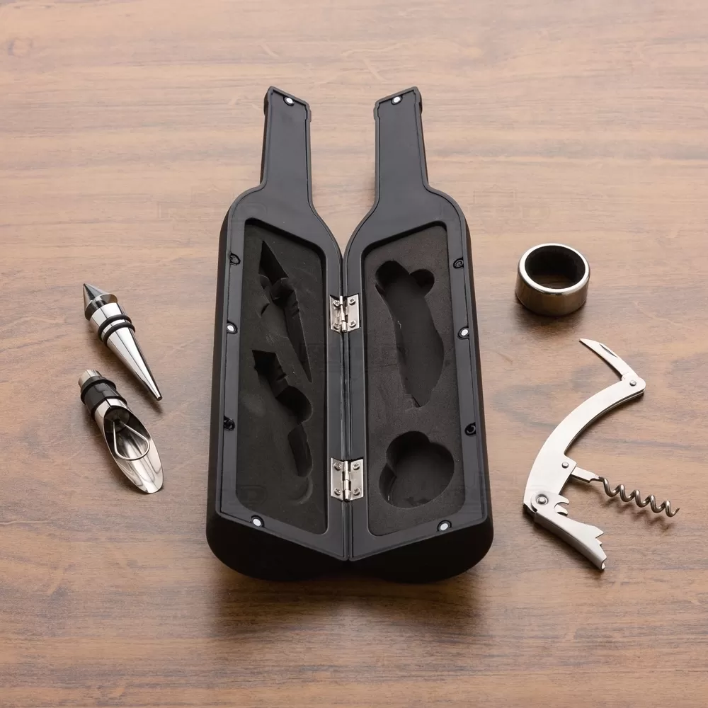 O kit vinho é um presente sofisticado e prático, projetado em forma de uma garrafa de vinho . Este conjunto elegante não só oferece todas as ferramentas essenciais para desfrutar de uma boa garrafa de vinho, mas também se destaca pelo seu design atraente e funcional. O estojo do kit é projetado em forma de uma garrafa de vinho, conferindo um charme especial e facilitando a integração com a decoração de qualquer ambiente, seja em casa ou em um evento. A abertura vertical do estojo permite um acesso fácil e rápido às peças, enquanto o fechamento imantado assegura que o kit permaneça bem fechado quando não estiver em uso, com interior revestido em espuma moldada, garantindo que cada peça fique segura e protegida contra impactos e arranhões. O kit inclui quatro acessórios, sendo eles, 01 saca-rolhas metálico com canivete, 01 corta-gotas, 01 tampa de bico e 01 bico para servir com tampa. Em resumo, o kit é uma combinação perfeita de funcionalidade e estilo. Com seu design exclusivo, este kit é uma escolha excelente para presentes corporativos, brindes promocionais ou para uso pessoal, proporcionando uma experiência mais agradável e sofisticada.