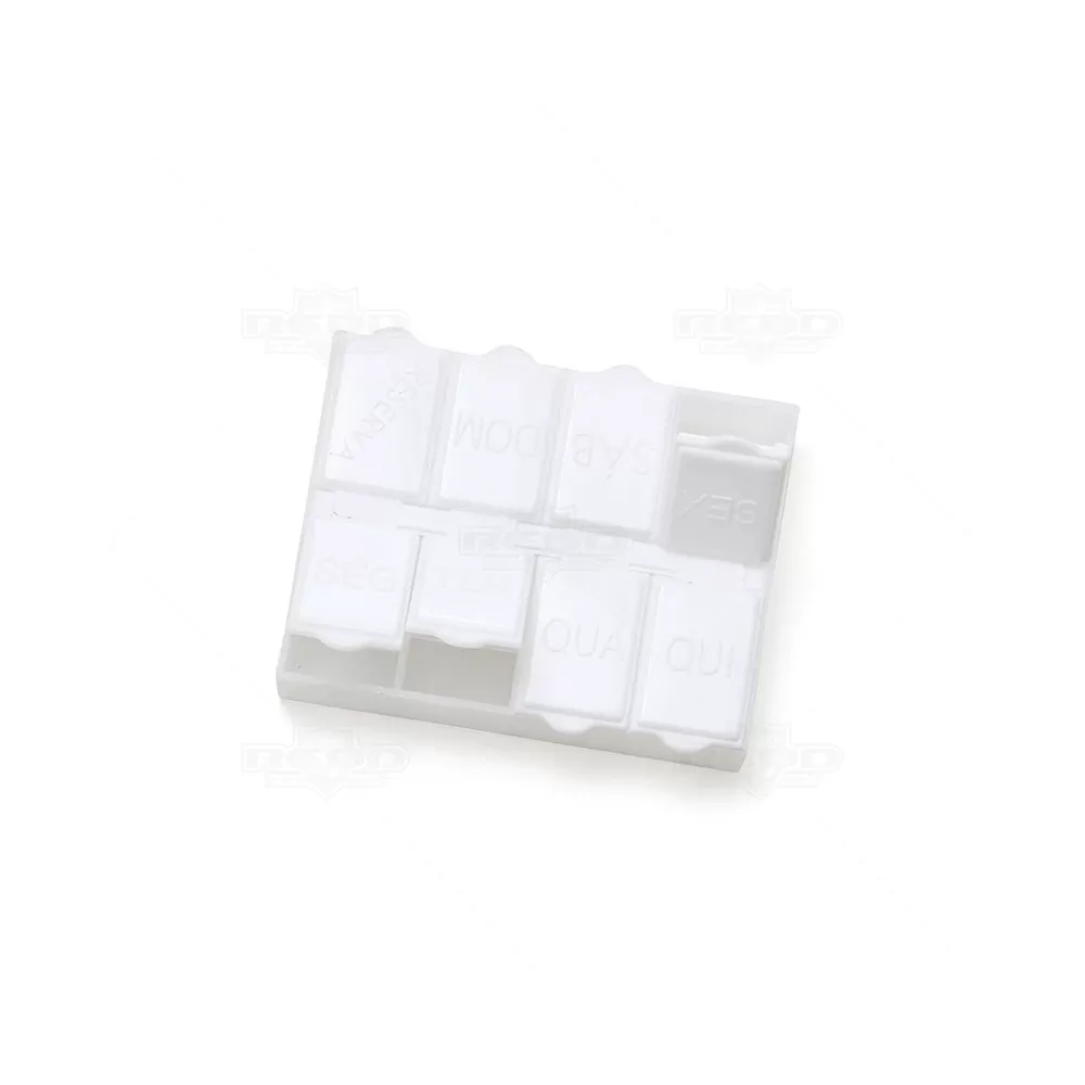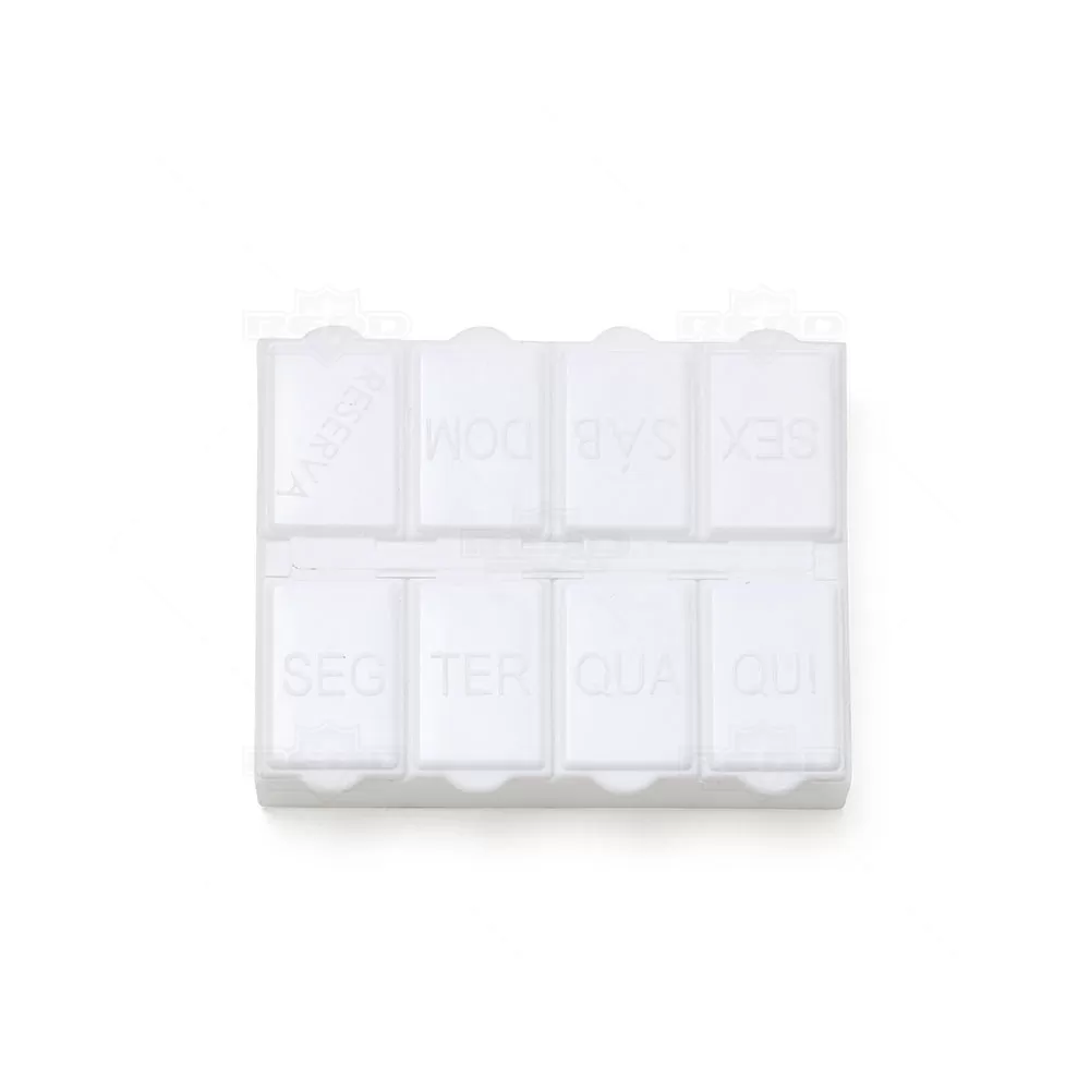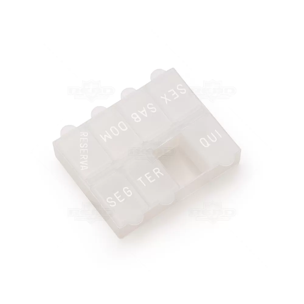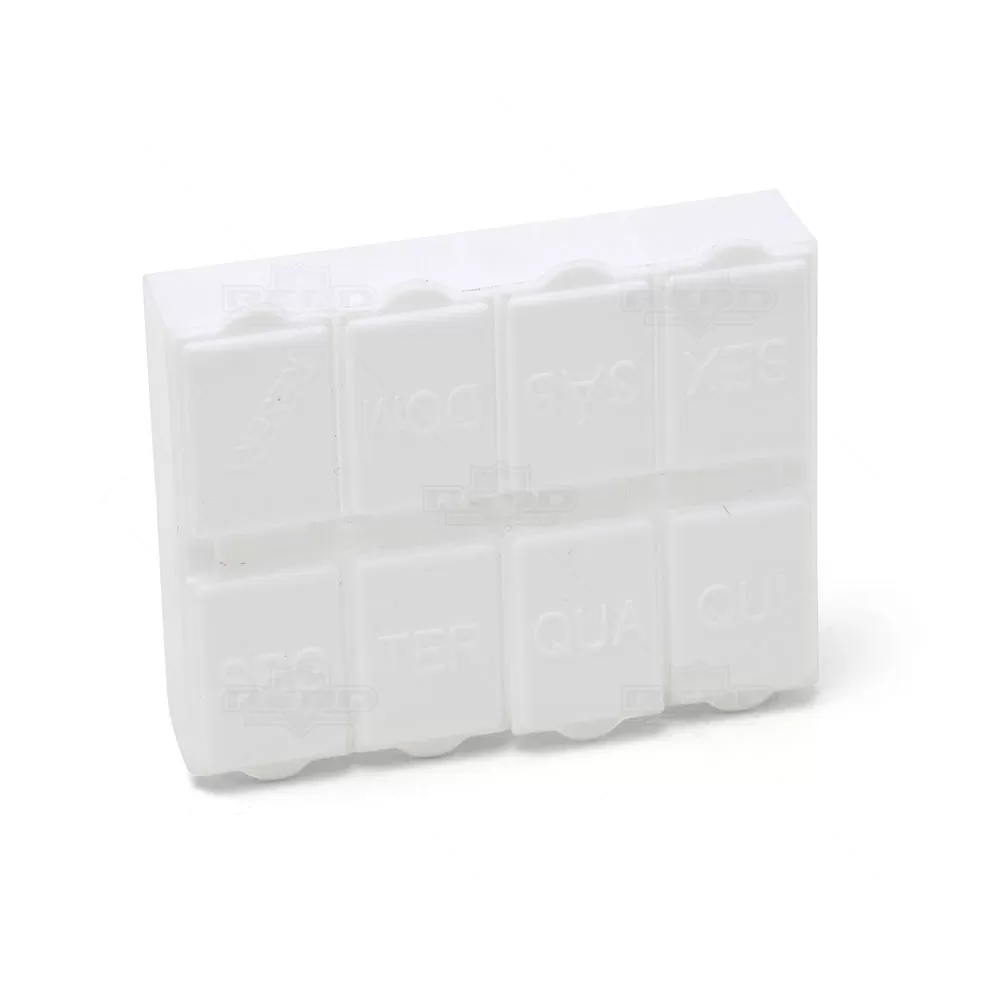 O porta comprimidos personalizado é um acessório prático e funcional, ideal para organizar e transportar medicamentos de forma segura e eficiente. Produzido em plástico atóxico, o porta comprimidos garante a segurança dos medicamentos armazenados, com seu design compacto e resistente torna este produto fácil de transportar, podendo ser levado na bolsa, mochila ou até mesmo no bolso. Isso proporciona conveniência e facilidade de acesso aos medicamentos, com 8 divisórias, cada uma equipada com uma tampa de proteção individual, garantindo que os comprimidos permaneçam seguros e evitam misturas indesejadas. Cada divisória tem uma marcação em relevo correspondente aos dias da semana, facilitando o gerenciamento da medicação diária. Além das divisórias diárias, há uma adicional marcada como "RESERVA", podendo armazenar comprimidos extras para uma emergência. A personalização do porta comprimidos com o logo na parte inferior proporciona uma excelente oportunidade de brinde promocional, destacando a marca de forma prática e útil no dia a dia dos clientes.