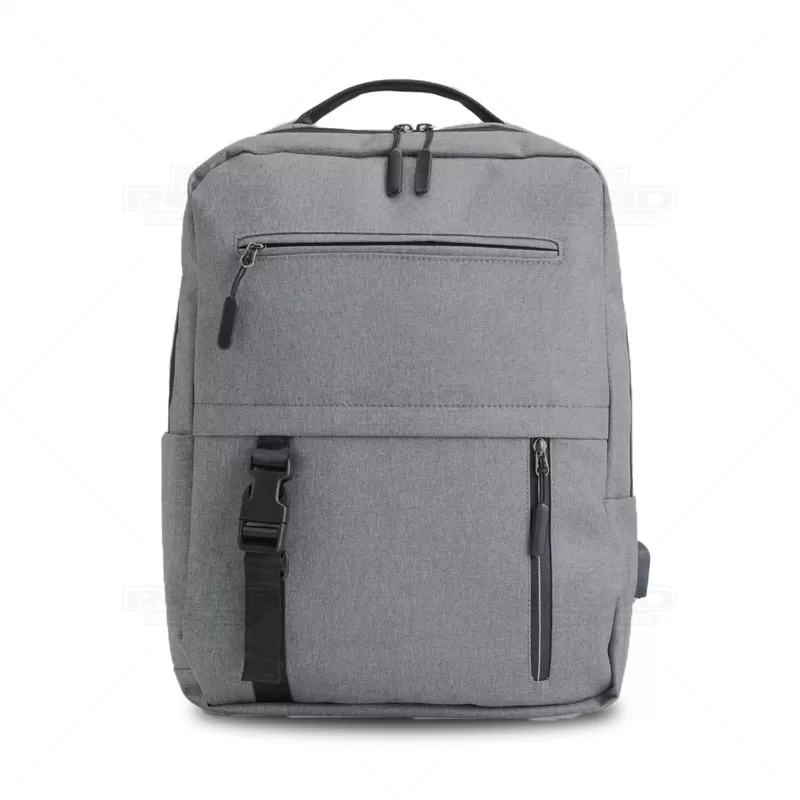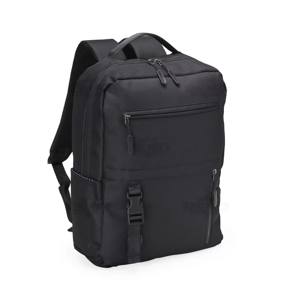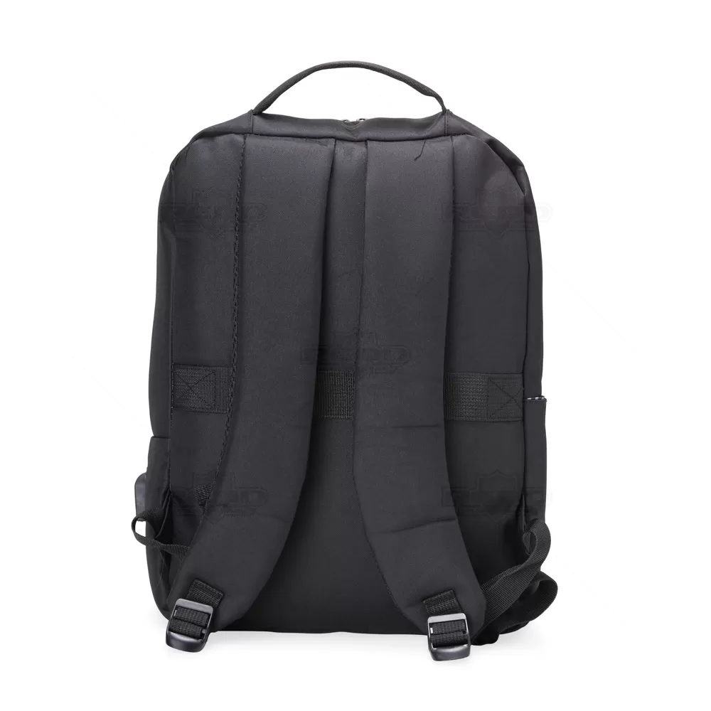 Mochila para notebook personalizada, produzida em nylon de alta qualidade, oferecendo durabilidade e resistência. Com um design funcional, ela conta com um bolso lateral e dois compartimentos frontais com fechamento em zíper, ideais para carregar acessórios e pertences pessoais. O compartimento principal é espaçoso e acomoda notebooks de até 15,6", além de possuir bolsos organizadores para canetas e documentos, proporcionando praticidade e organização. O diferencial desta mochila é a entrada USB, que permite conectar um powerbank (não incluído) e carregar dispositivos eletrônicos sem a necessidade de manter a mochila aberta. As alças de ombro são ajustáveis e acolchoadas, garantindo conforto durante o transporte, enquanto a faixa trolley facilita o uso em viagens, permitindo encaixar a mochila na alça da mala e ainda conta com alça de mão. Ideal para brindes e eventos, esta mochila combina estilo e funcionalidade, promovendo a marca de maneira prática e elegante. *Imagem Ilustrativa, itens internos não acompanham o produto.